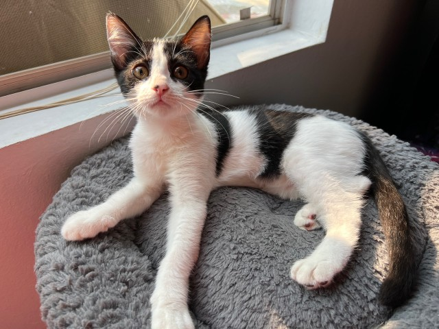 Meet Betty! This adorable “cow” cat is full of energy and loves to run and play with her brother. She’s a big fan of dangly wand toys and goes wild for her favorite cat treats—definitely food motivated! Give her a few gentle head scratches, and she’ll be purring in no time. Betty is a sweet, playful girl looking for a forever home to call her