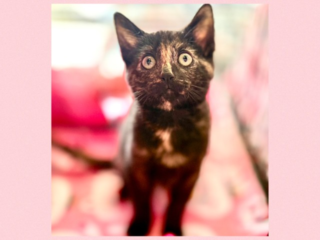 Gigabyte or Gigi is a playful, curious tortoiseshell kitten with a big personality in a tiny package. She loves chasing toys, exploring new spaces, and curling up for warm snuggles when she’s done zooming. With her striking tortie markings and sweet, sassy charm, she’s ready to bring joy to her forever home.