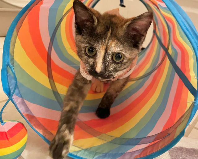 Meredith is a sweet, outgoing little kitten who loves everyone she meets! She’s the kind of kitty who wants to be a part of everything-whether that’s chasing toy balls across the floor or cuddling up with you to take a nap. She always wants to be with her humans. She’s quick to purr and adores being carried. She gets along great with her feline foster friends. If you are looking for a loving companion who will be your shadow and snuggle buddy, Meredith is your girl!