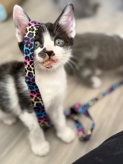 Moscow Mule is a curious explorer who always wants to know what’s going on. She’s adventurous, outgoing, and has a sparkling personality that will keep you entertained. When she’s done playing, she’s happiest snuggled up in your lap. She is available for pre-adoption now, and will be ready to go to her new forever home in late October.