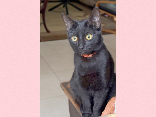 My name is Naranja, Nara for short. Spanish for Orange. I’m a sleek, shiny little black panther kitten. If you are looking for a pair of sisters, I would love to be adopted with my sister Azule or Zuli for short. We are pictured together. I am playful, social, and full of energy. I love toy mice (they never see me coming), and I’m a master of racing up and down cat trees with the grace of a jungle queen. I’m also outgoing and confident. Azule & I have the best zoomie sessions together! I’m always happy to get attention and pets (on my schedule, of course), and I promise I’m no diva—not finicky at all, and always a litter box champ.