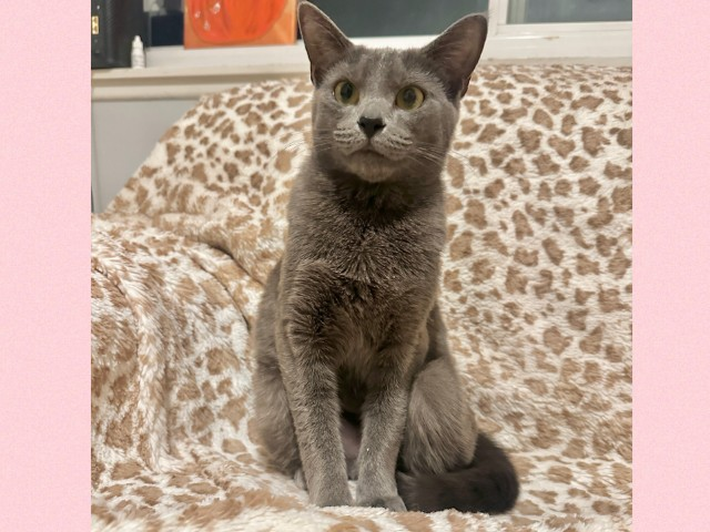 She would do best as the only kitty in the home, as Russian Blues are known for their deep loyalty and strong bonds with their family. Royal has a calm, gentle personality but still has a playful side she especially loves playing fetch with her favorite little bird toy.