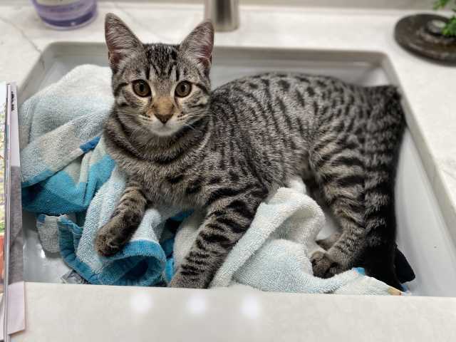 Super sweet and sassy Sequoia is a loving girl. She has a gorgeous spotted coat. Smart, cuddly and rightly mischievous as a youngster should be, she loves to nap with you and is very self-entertaining. She gets along great and loves to play with dogs. Give her a bottle cap and she will play with it for hours. Apply to meet her today!