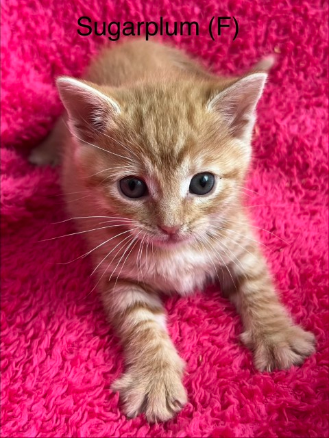 Sugarplum is the sweetest and wants to be cuddled and carried as often as possible. She can be feisty playing with her brothers but she is definitely the lovey one.